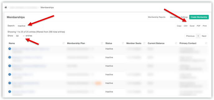 Search and filter: Use the search bar to narrow your view. For example, type “inactive” to only display inactive memberships.