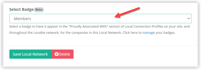 Choose the Local Network that will receive the badge and click 'Edit', then scroll to the bottom and select the badge to apply to the companies in this Local Network.