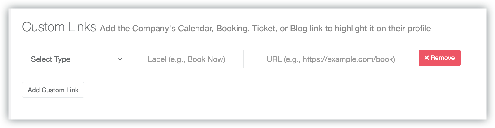 Custom Links allow you to add important URLs directly to your Business Profile. These links appear on your profile page in the directory and display with a type-based icon and your custom label.