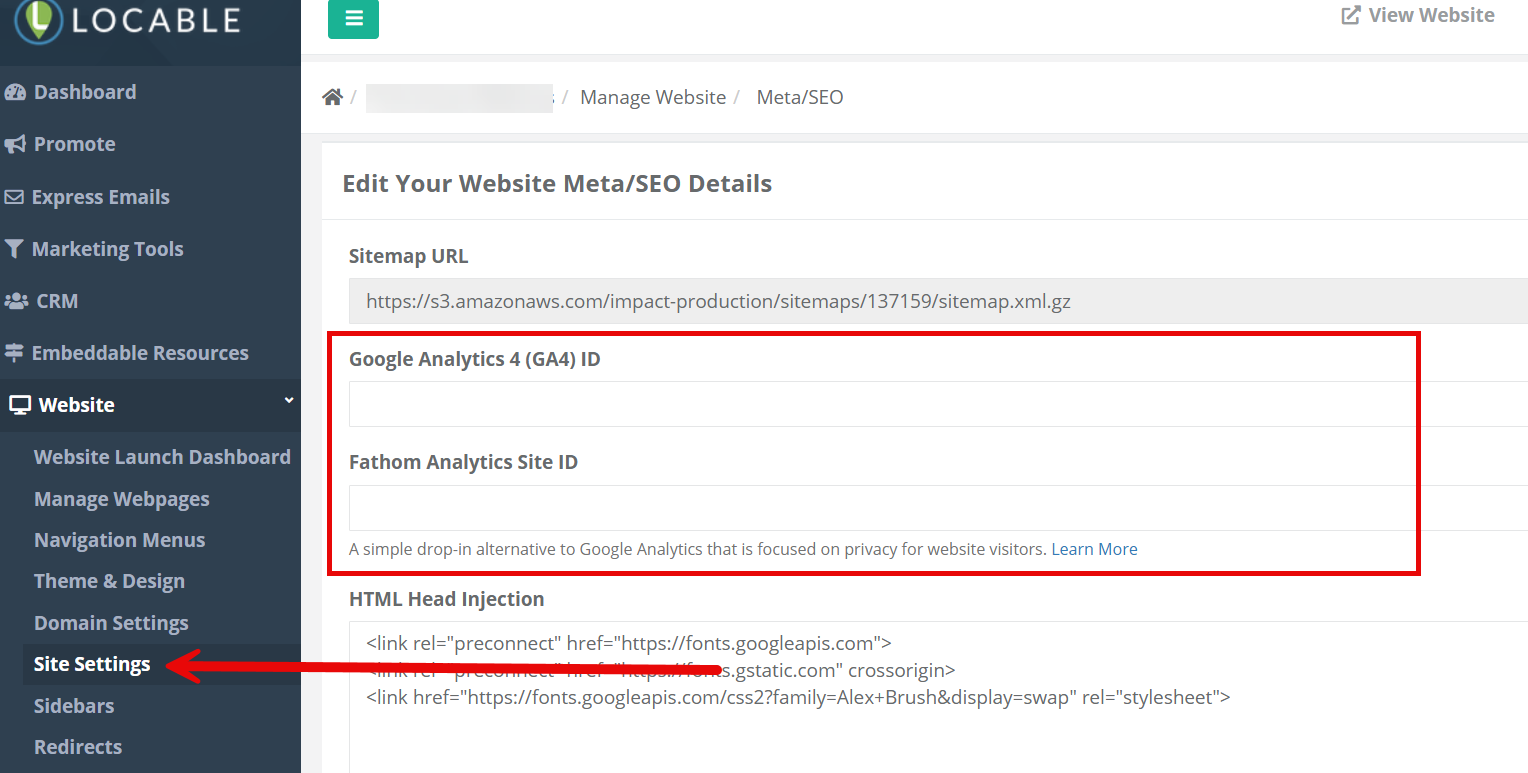 Fathom will provide you with a tracking code (site ID) and you can add it to your site by clicking Website > Site Settings, then insert your code into the Fathom Analytics ID field and save.