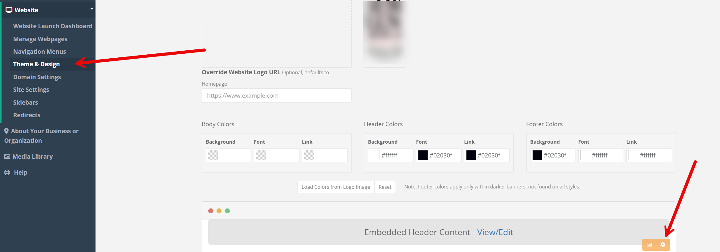 There's one more step to adding them to your website header. Click Website > Theme & Design. From here you need to click to the right on the Gear Icon to edit Header settings.