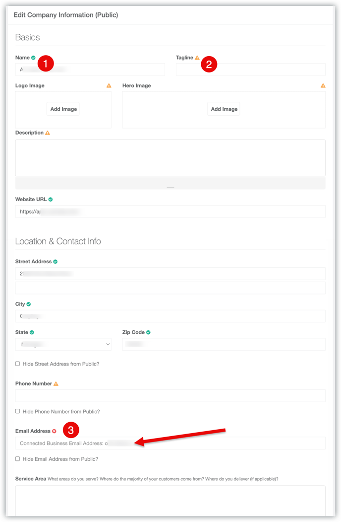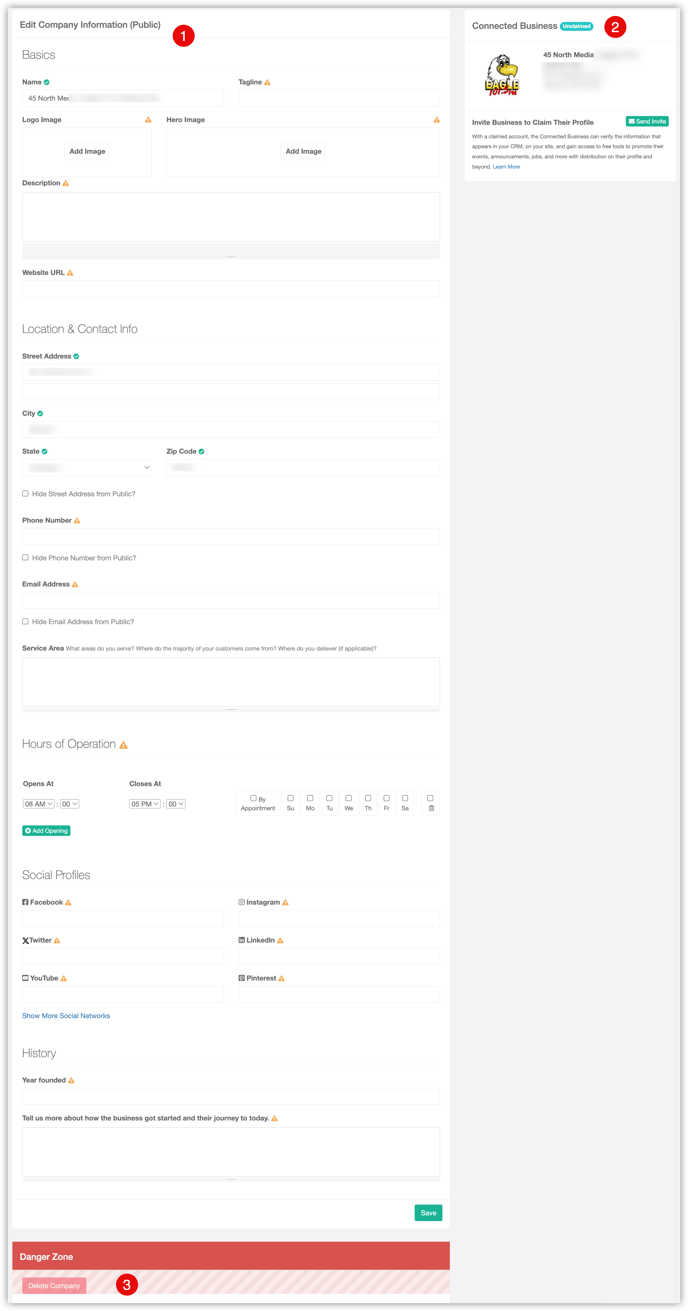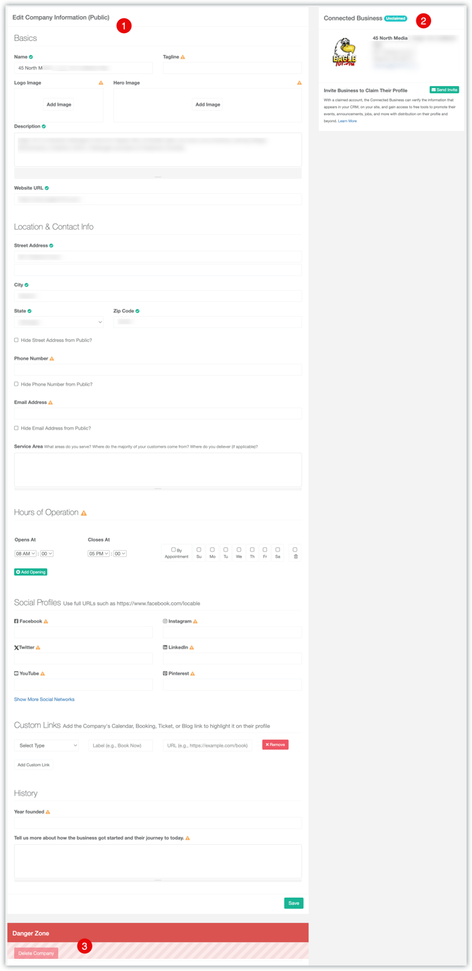 - The Company Information (Public) are the details that will appear on your website when you include this Local Connection™ on your website. You can update the Public Company Data to customize how the Connected Business is displayed on your website and in your CRM.