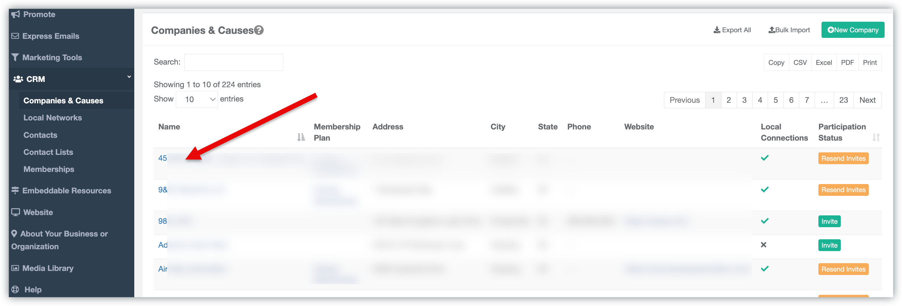 In your Locable account, navigate to CRM > Companies & Causes. Find the business and click on the business name to open their company record.