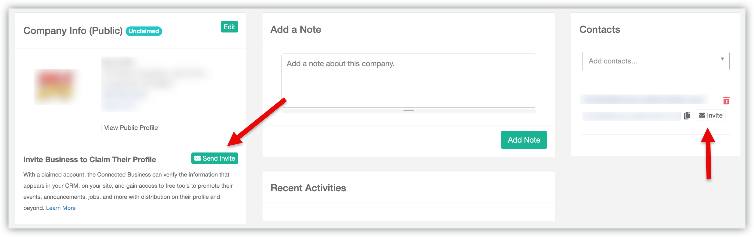 - Click 'Invite' button next to the associated contact you wish to invite to claim the business profile and our system to pre-populate the email template and customize it for that person. Then click to Send the Invite.