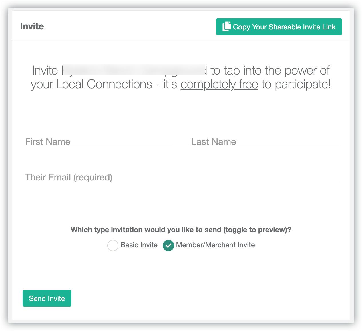 If you’d rather create your own custom invitation email, you can use your unique shareable invite link instead. This link can be shared with your Local Connections™ in a variety of ways, like adding it to: