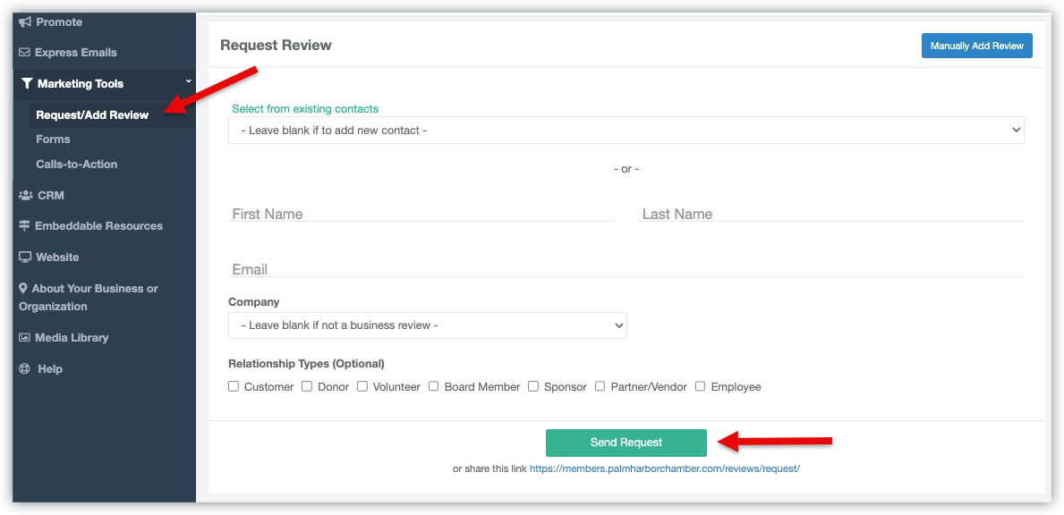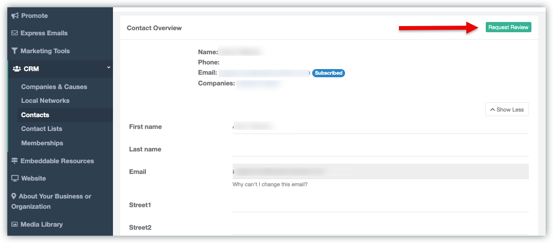 You can also request a review directly from an individual contact record by going to CRM > Contacts, selecting the contact, and clicking Request Review: