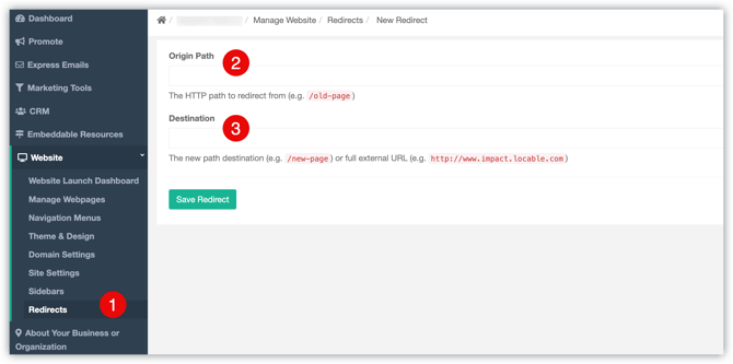Setting up a 301 redirect in your Locable account is simple: