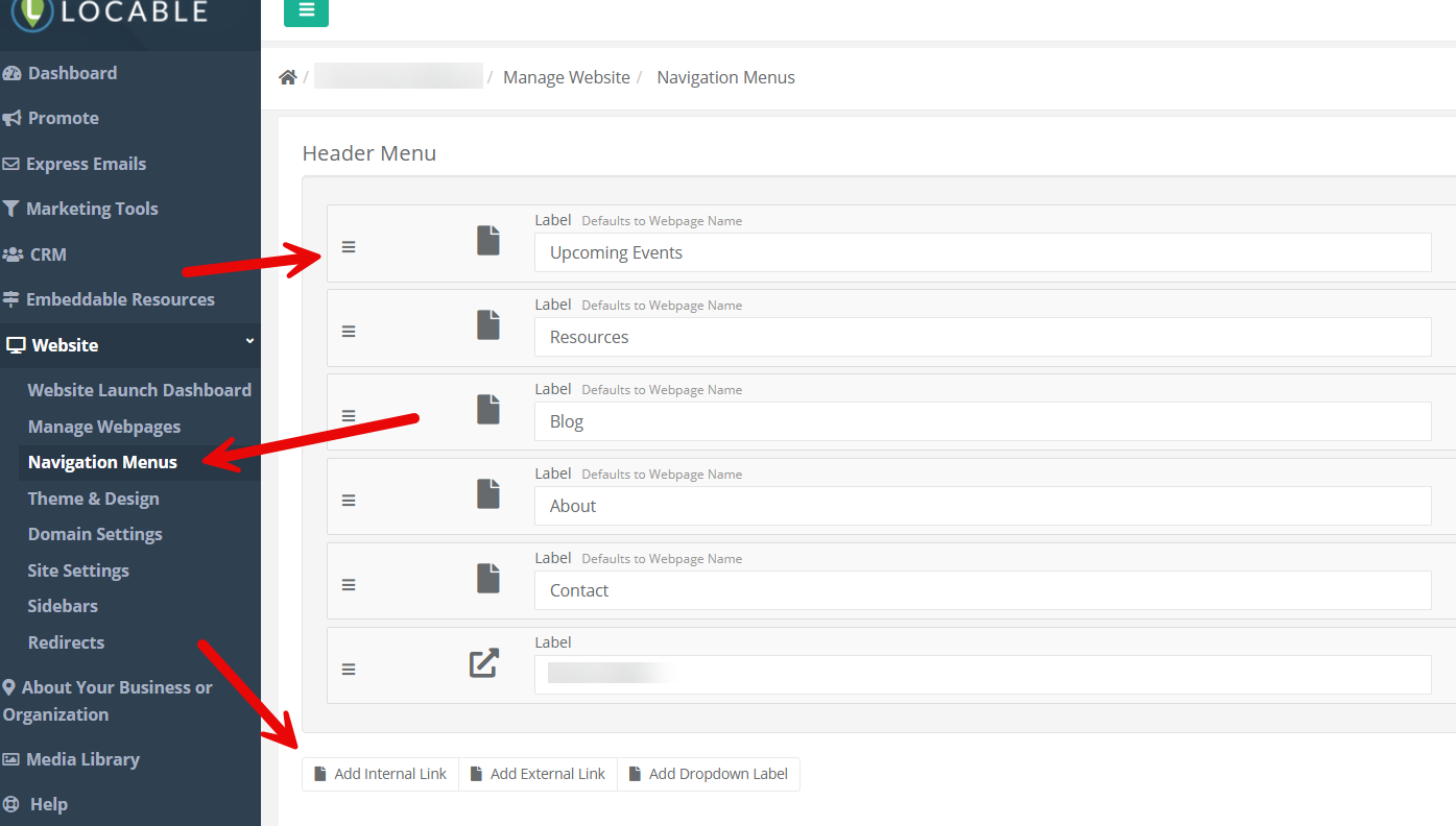 - To reorder existing menu items, click and drag the three lines to the left of an item.