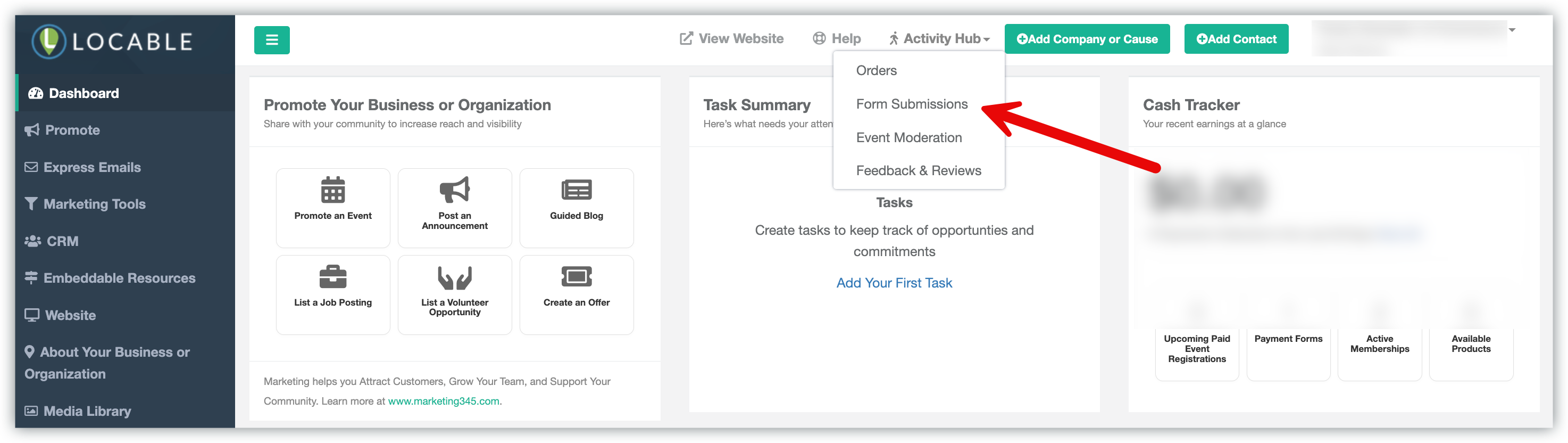 Once a new membership application form is submitted on your website, you can access that data by clicking Activity Hub > Form Submissions.